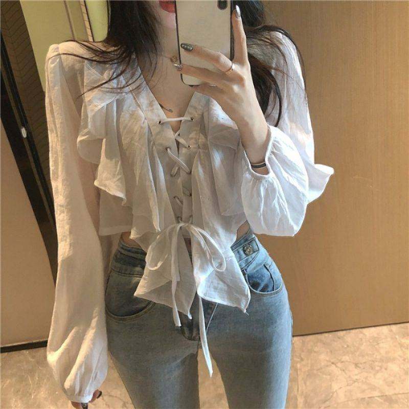 设计感小众V领边交叉系带短款别致百搭2019年秋季长袖衬衫上衣女热门设计联盟服务商