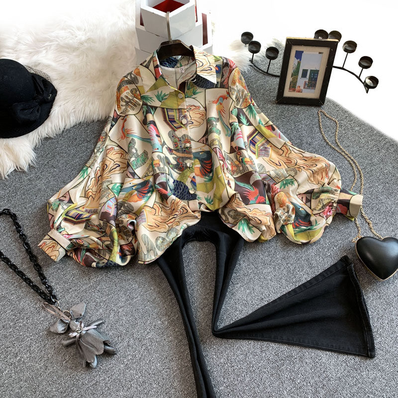 欧洲站2021春季新款复古设计感大码宽松遮肚上衣印花灯笼袖衬衫女热门设计联盟服务商